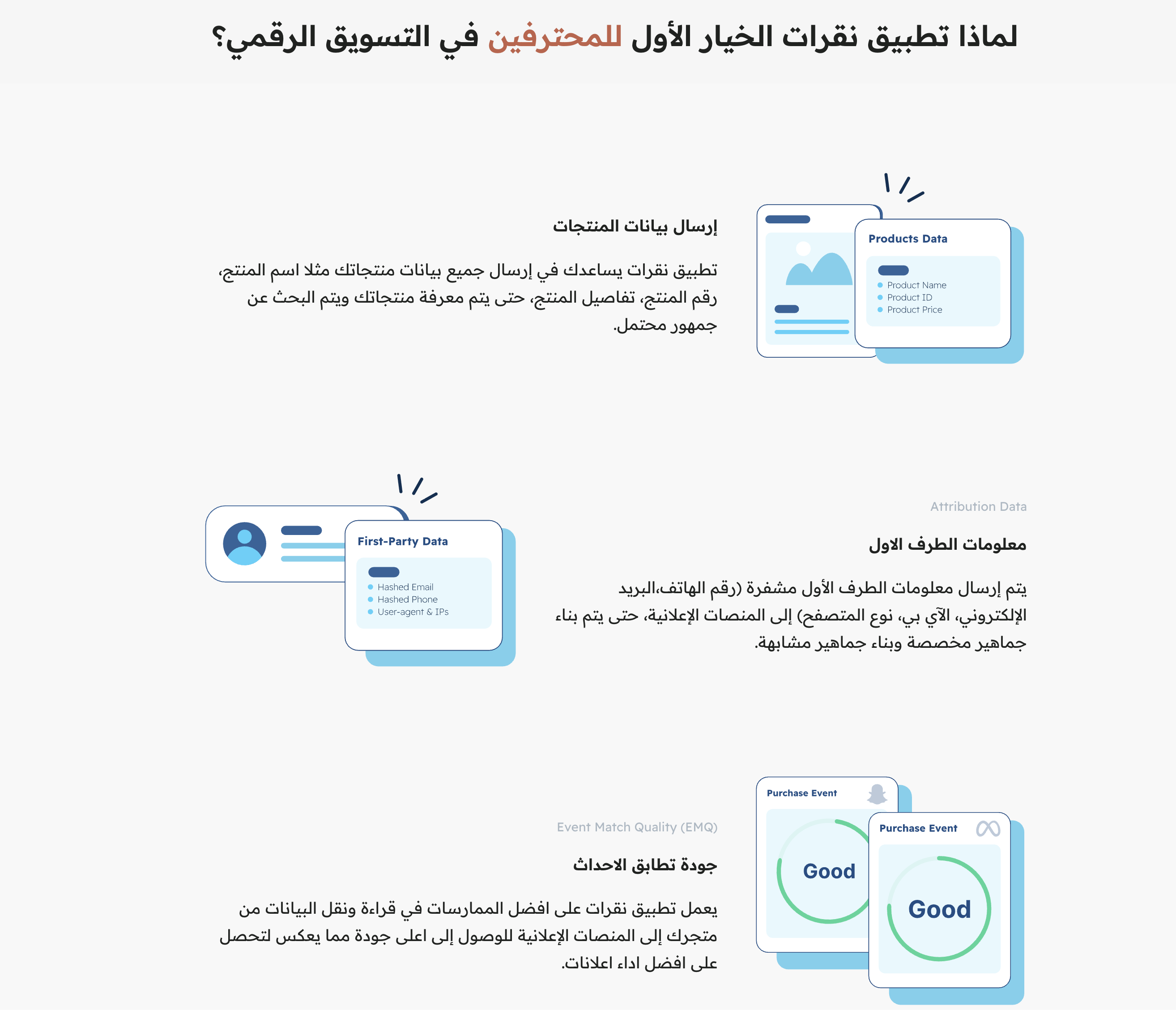 خفّض تكاليف حملاتك الإعلانية وحسّن استهداف عملائك بدقة عالية مع Conversion API، إرسال بيانات بشكل أسرع ودقيقة إلى القنوات الإعلانية.